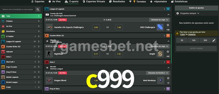 O c999 oferece uma grande seleção de opções de apostas em e-sports com probabilidades competitivas